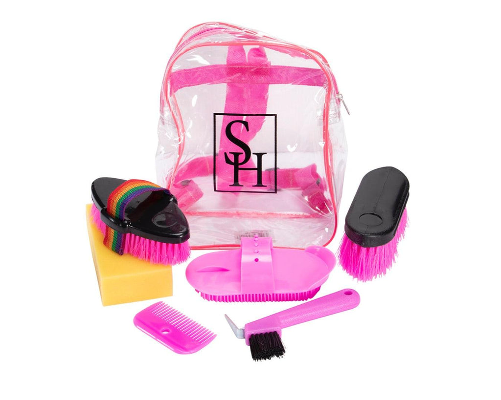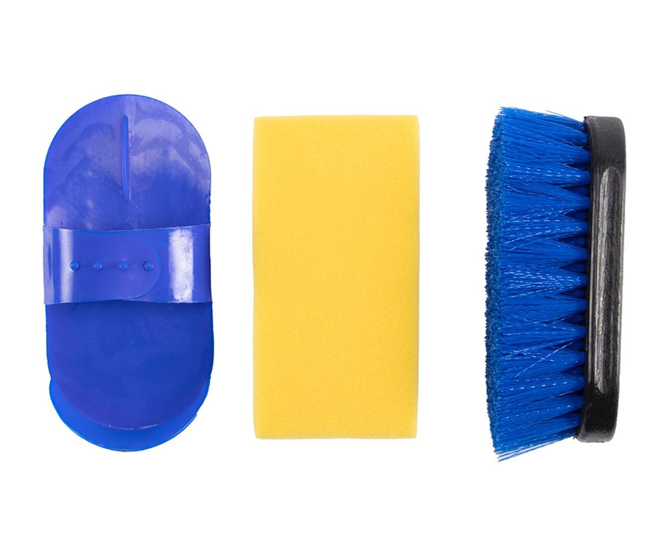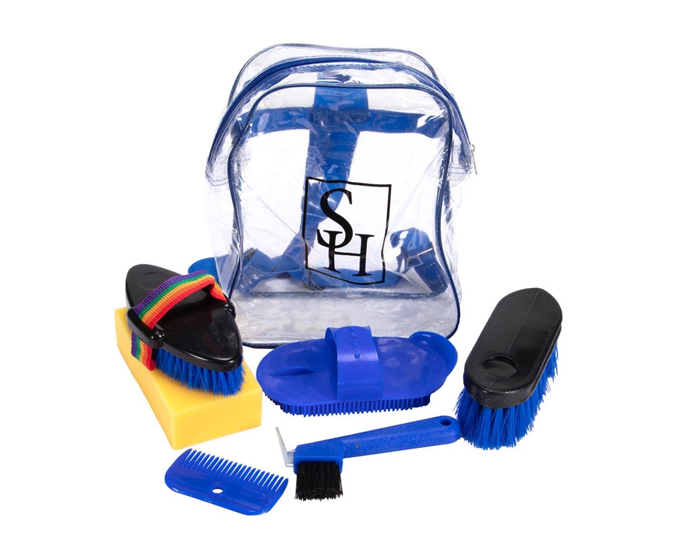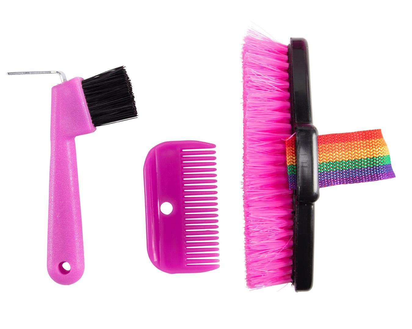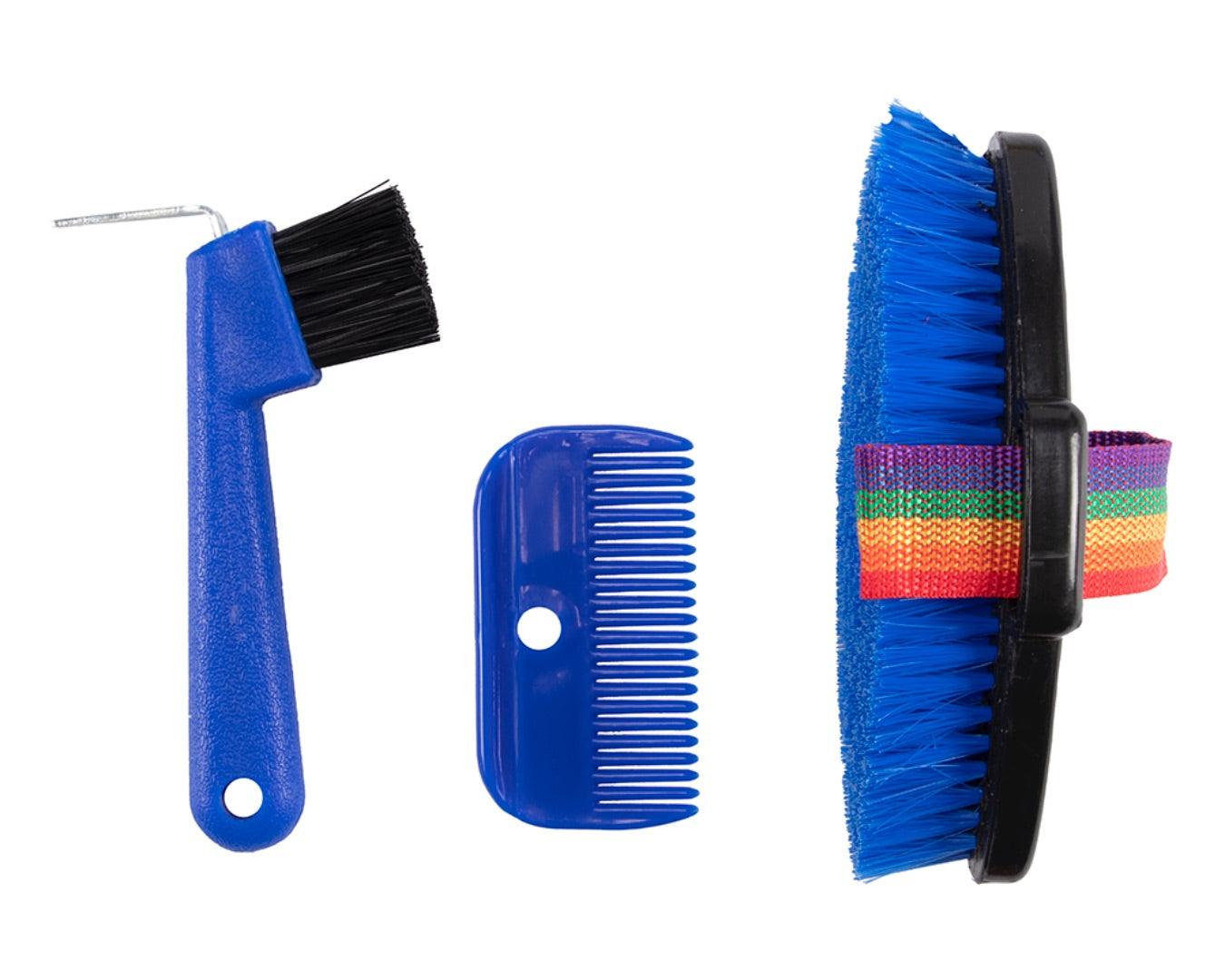 Handy grooming kit containing body brush, dandy brush, plastic curry comb, mane comb, hoof pick, and sponge.