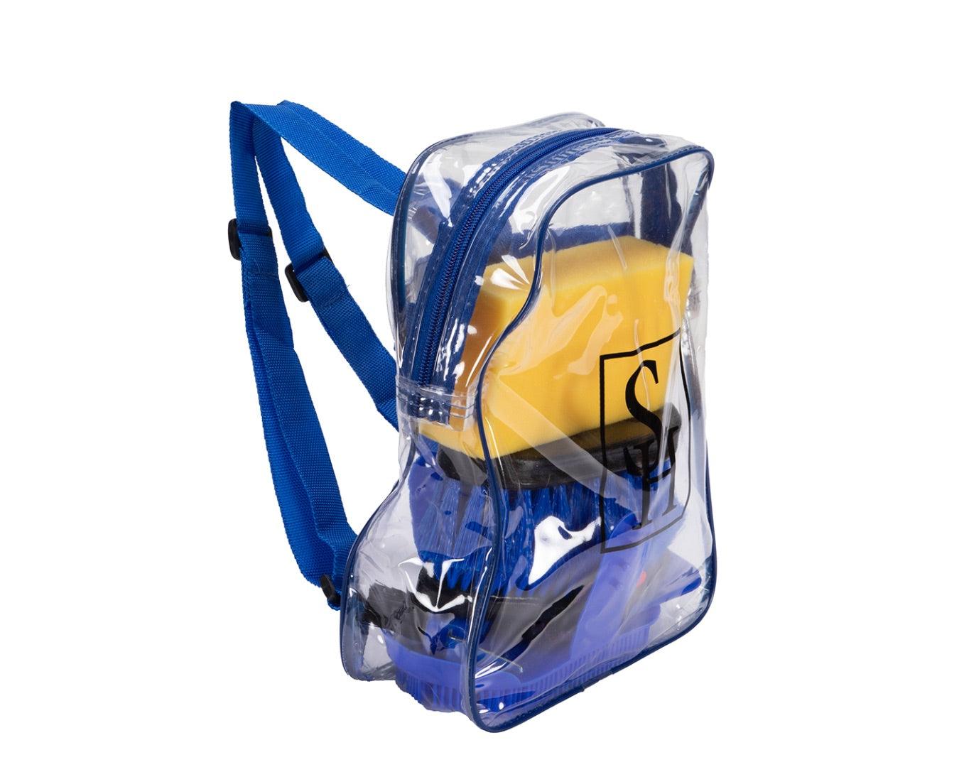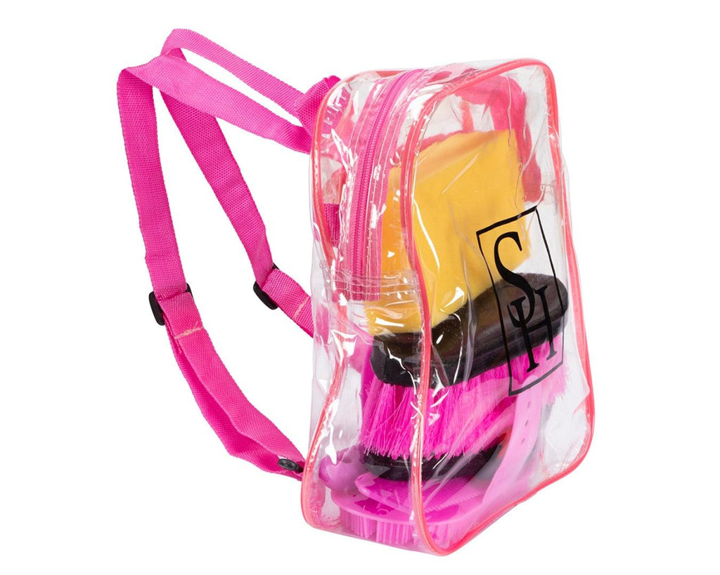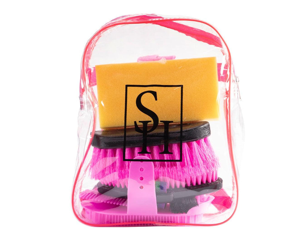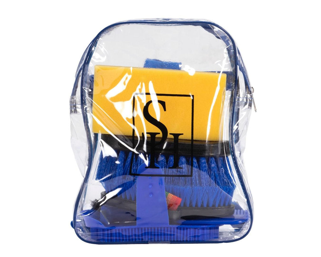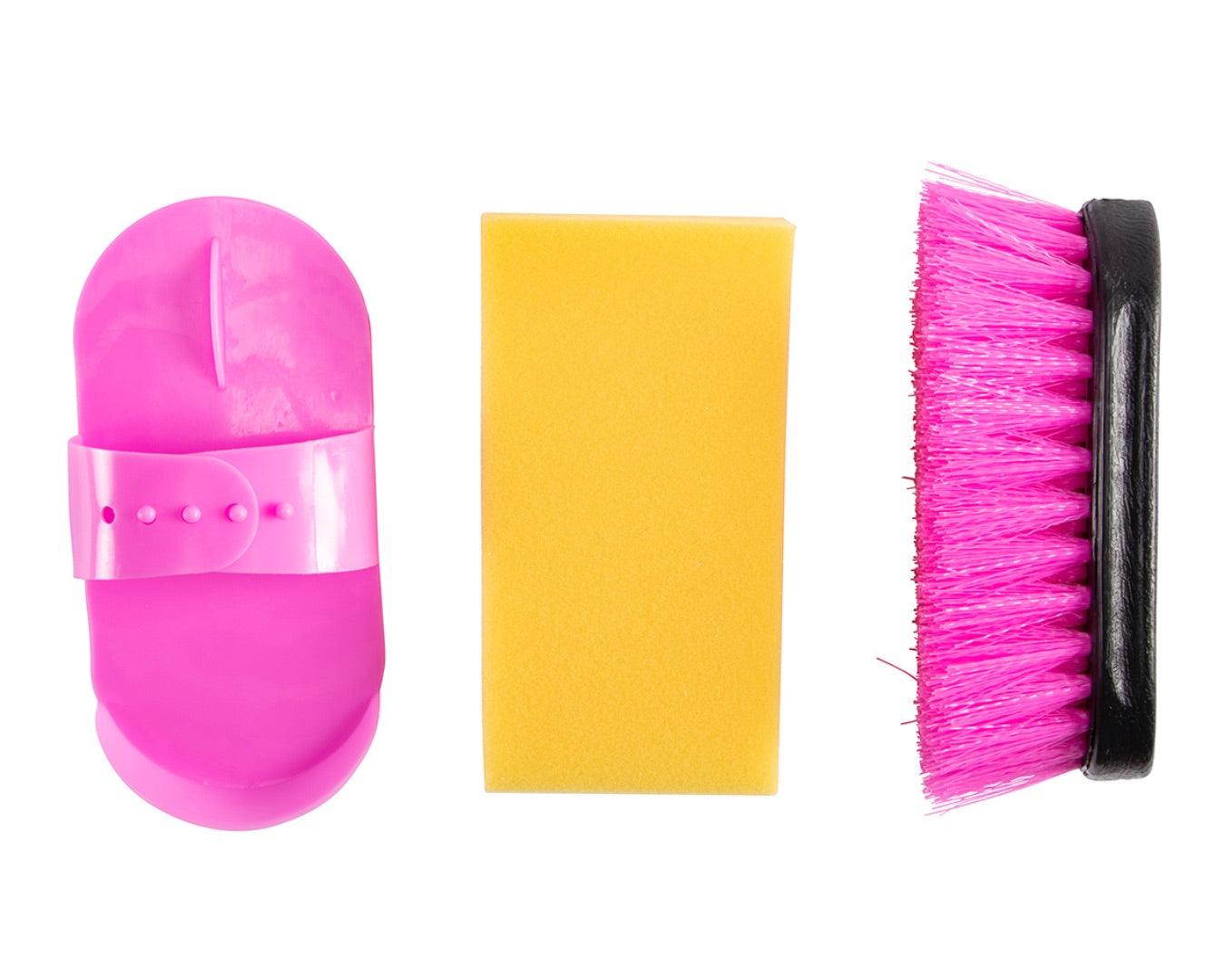 Handy grooming kit containing body brush, dandy brush, plastic curry comb, mane comb, hoof pick, and sponge.