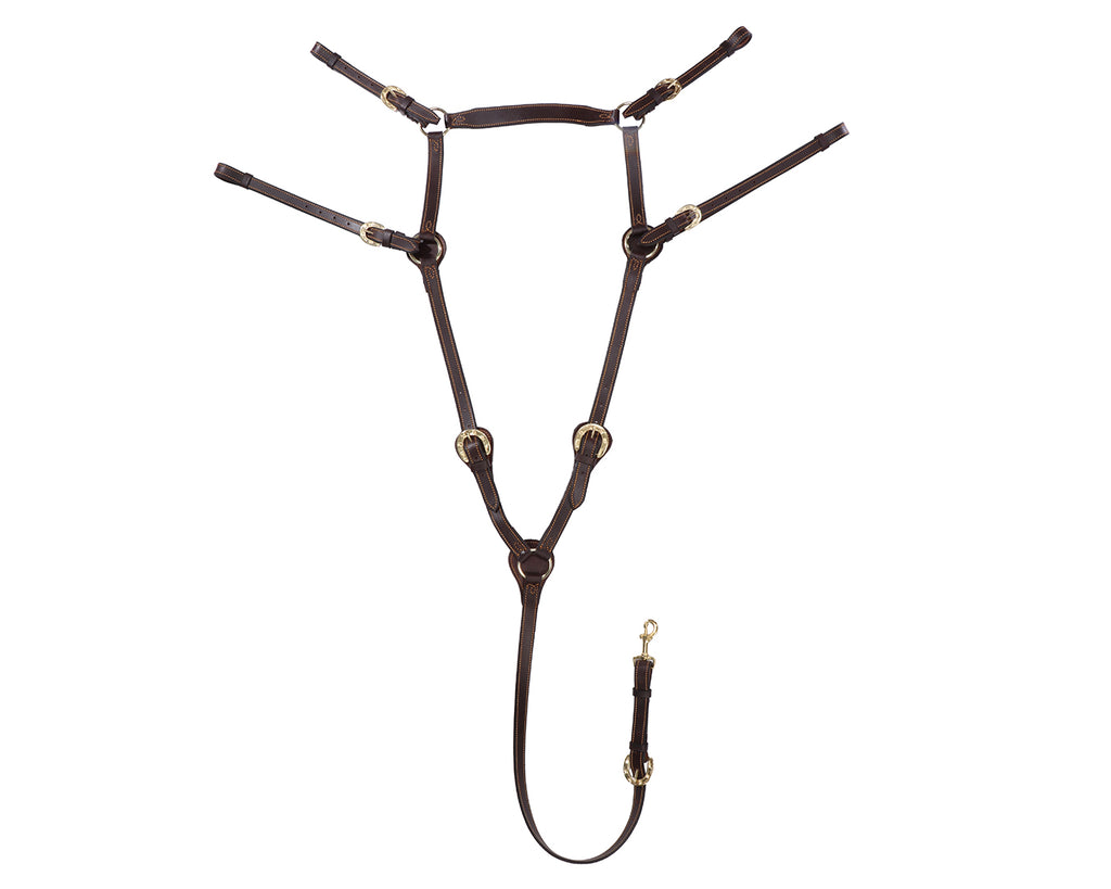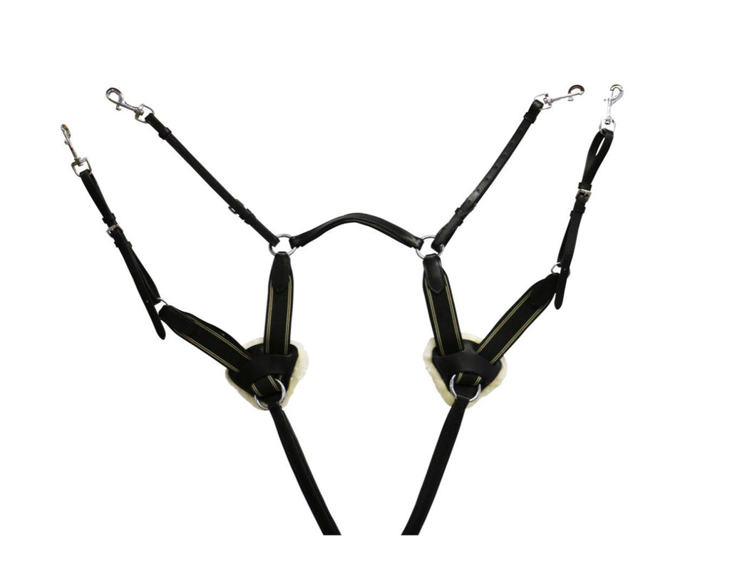 Enhance your horse's safety and performance with the Happy Horse Five Point Breastplate. This breastplate features a padded leather breast pad and straps that extend up to the saddle points, providing stability and support during riding.