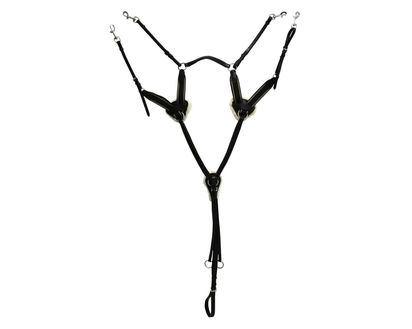 The breastplate is equipped with removable Martingale rings, allowing for versatile use. The two saddle points on each side are designed with snap hooks and an equalizing elastic setup with faux sheepskin backing, ensuring a secure and comfortable fit.