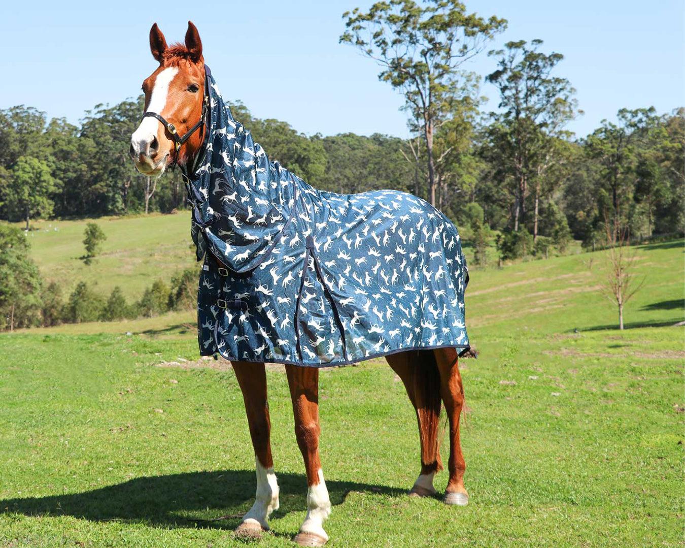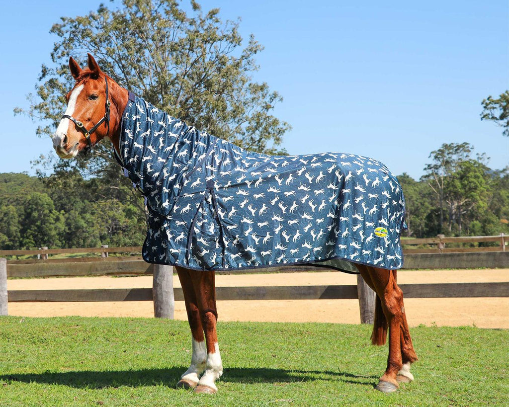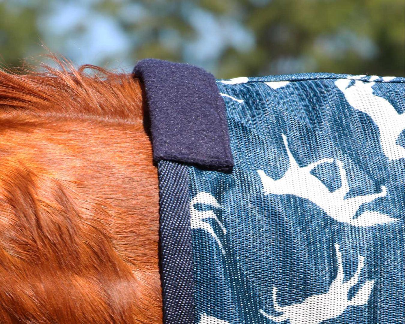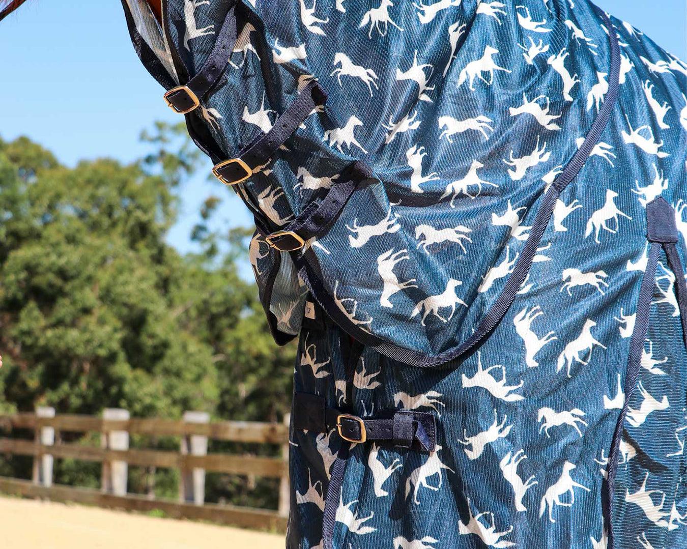 Introducing the Horsemaster Fly Mesh Combo Rug in a striking blue and white horse print, designed to provide exceptional protection against insects while ensuring your horse stays cool and comfortable. This lightweight rug features a durable mesh construction that promotes breathability, making it perfect for warm weather.