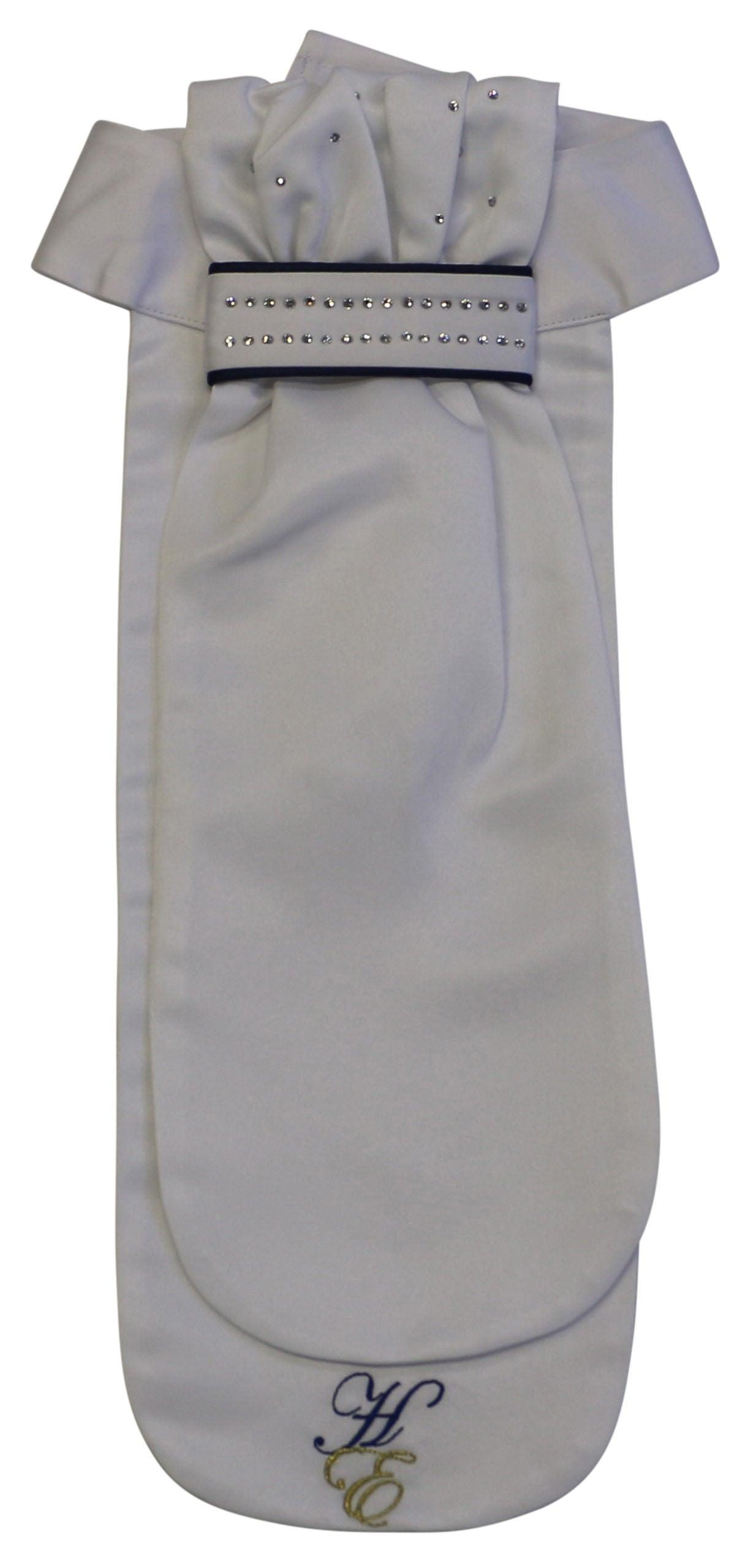 For a modern take on traditional equestrian dressage, this stunning white stock tie with navy binding is a must-have fashion accessory. Beautifully pleated with dazzling crystals, you are sure to turn heads at your next equestrian event. The long tie flap will fit any style jacket, and a Velcro fastening on the back provides a fast and easy change.
