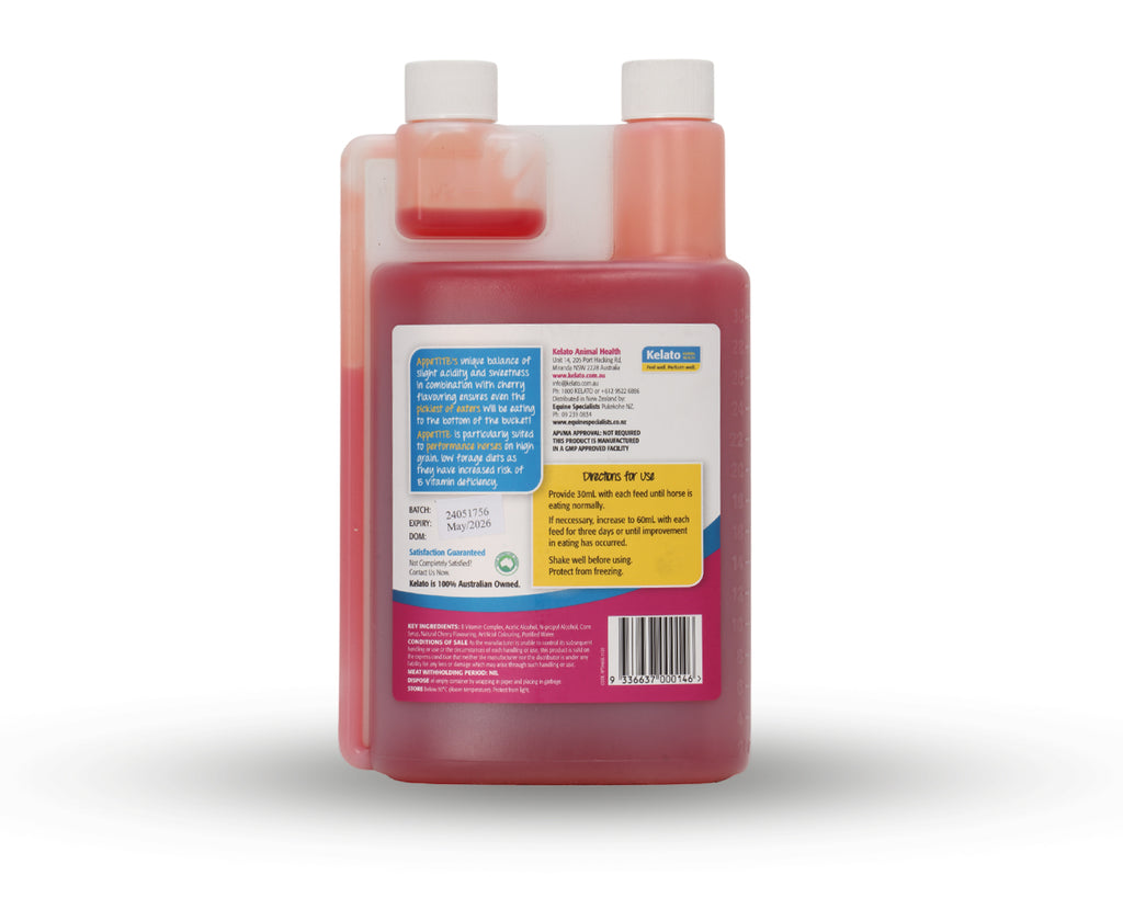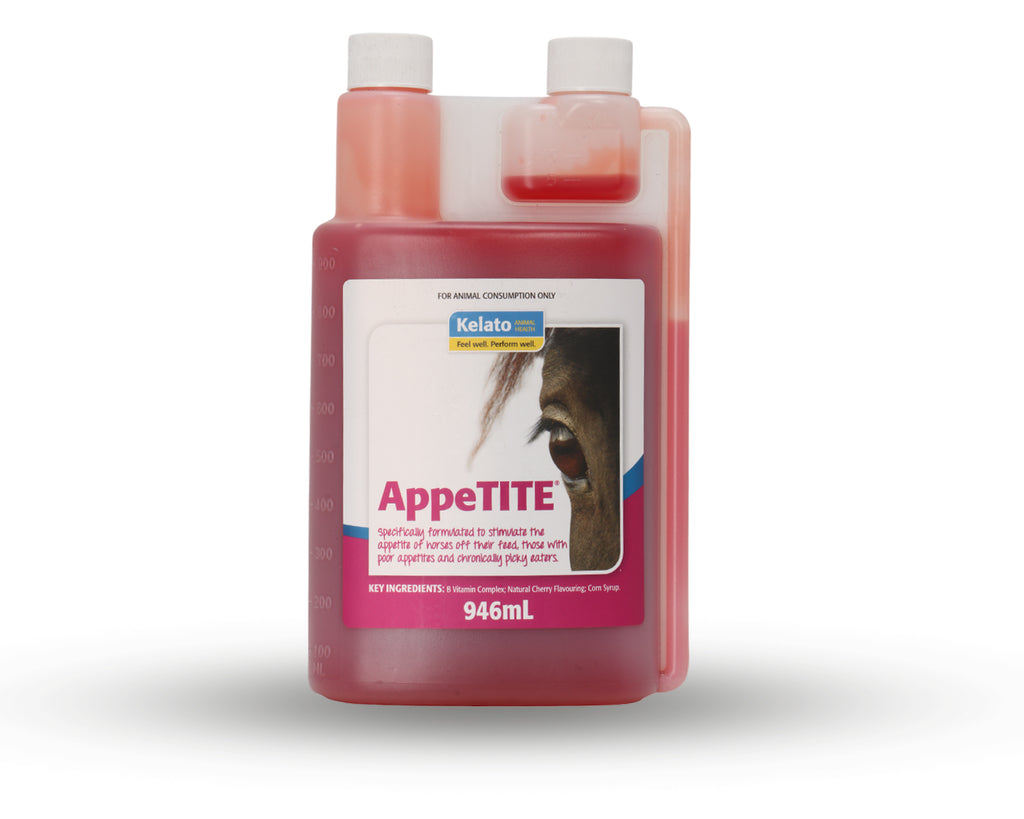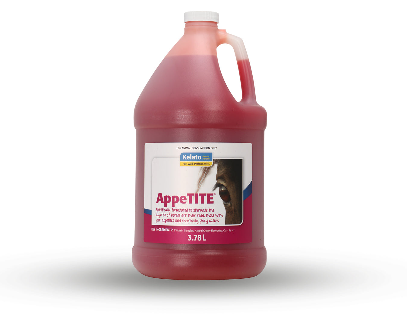 AppeTITE is a highly palatable, cherry flavoured liquid that stimulates hunger and encourages eating when horses are off their feed. It is a liquid formula that can be used daily to improve eating habits or strategically for horses off their feed.It’s concentrated level of B vitamins stimulates the hunger reflex in the horse making him want to eat and look for food. It is also slightly acidic, which causes the horse to lick and produce saliva, stimulating the horse to eat.