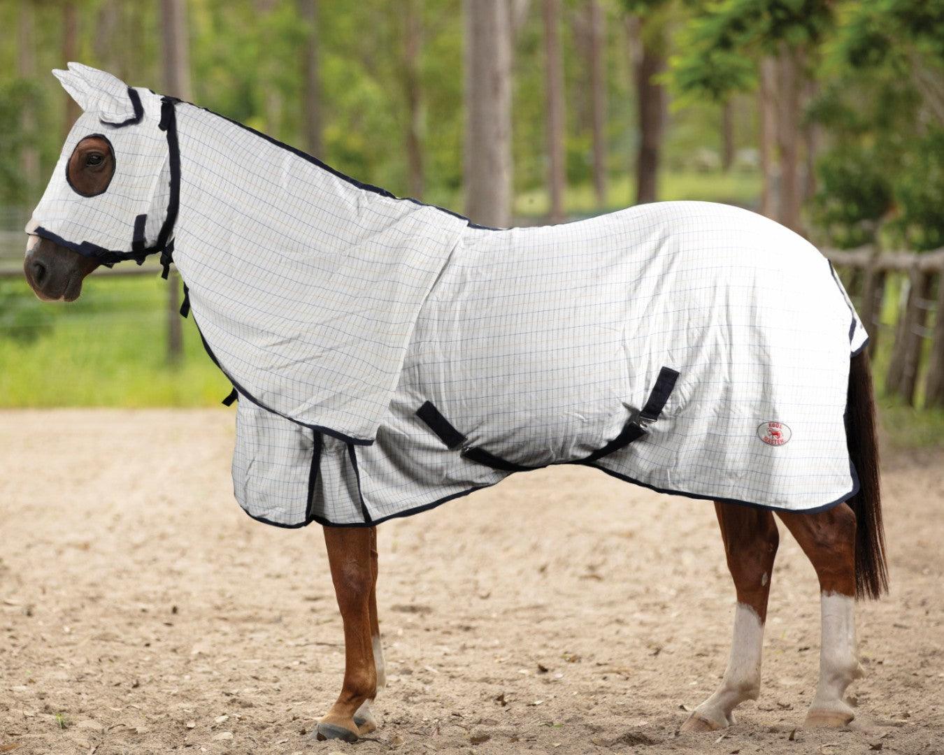 Protect your horse from irritating summer insects with the Kool Master Insectbuster T-Stop Hood Combo. Made from fine, durable, and breathable mesh, this combo offers superior insect and UV protection while keeping your horse cool. It features a full hood with covered ears and a soft fleece nose guard to prevent rubbing. Designed for comfort and security, it includes a poll strap, shoulder gusset, double crossover surcingles, large tail flap, and removable leg straps for a perfect fit. Ideal for summer fly control, this combo rug keeps your horse comfortable and protected. Shop now to give your horse premium insect defence and summer comfort.