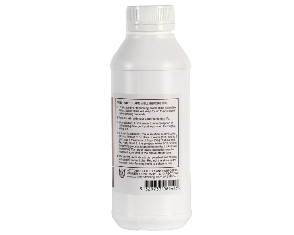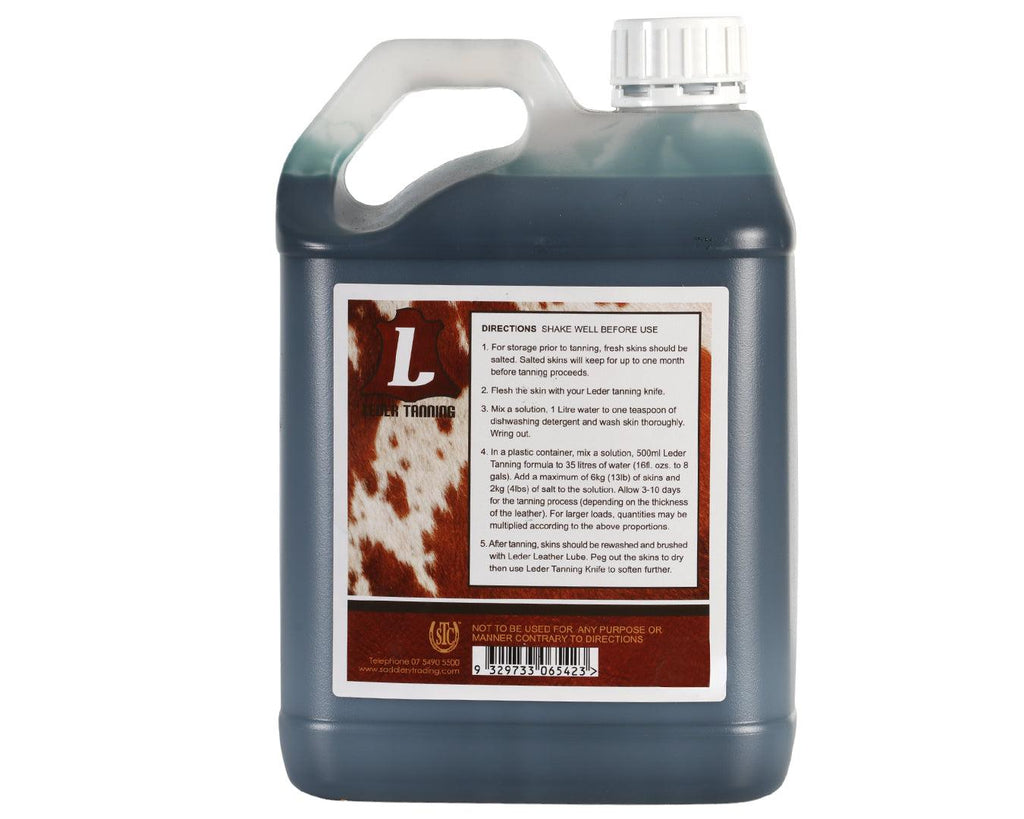 Tanning the Skin: Mix 500mL of the Leder Tanning Formula with 35 litres of water in a suitable bucket or tub and place skin into the solution. Soak the skin for between 3 and 10 days, depending on the thickness of the hide. Carefully check the hide during this time to ensure there are no folds and that the hide is tanning evenly.