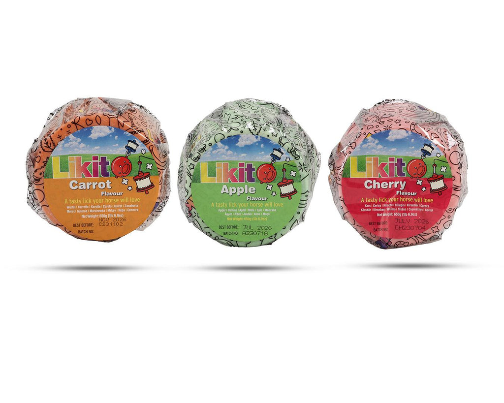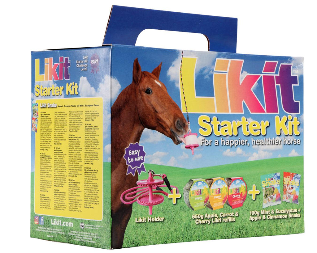 Discover the easiest way to introduce your horse to Likit with the Likit Starter Kit in blue. This all in one kit includes a Likit Holder, three assorted 600g (approx.) Likit refills in Carrot, Cherry, and Apple flavours, plus two Likit Treat Bars in Apple and Carrot.