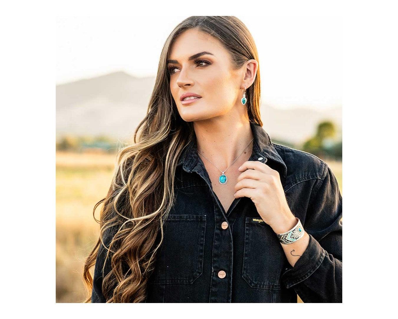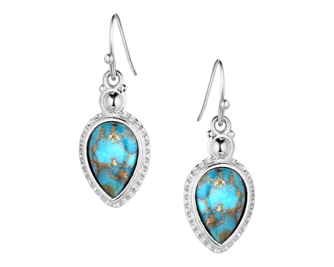 Carry the essence of the West with the Expression of the West Turquoise Earrings. These stunning earrings feature a bold teardrop-shaped genuine turquoise stone, elegantly compressed with copper for a unique look. Surrounding the vibrant turquoise is a bright silver tone that beautifully contrasts with the stone, enhancing its natural beauty. Designed with hypoallergenic French wires, these earrings dangle gracefully, adding movement and flair to any outfit. Perfect for both casual and formal occasions, each pair is unique as stone colours may vary. Elevate your accessory game and express your love for western style—shop now!
