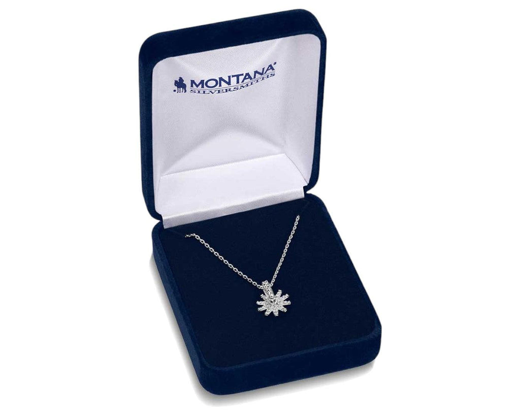 Embrace spontaneity with the Montana Silversmiths Spur of the Moment Necklace, a stunning piece that captures the spirit of unexpected adventures. Featuring a detailed spur end in bright silver tone, this necklace showcases an intricate design with a spinning rowel covered in sparkling cubic zirconia crystals. The 19-inch adjustable rhodium-plated chain ensures a perfect fit for any style. Crafted with rhodium over a brass base and protected by Montana Armor, this necklace is both a fashion statement and a reminder to seize life's unplanned moments.