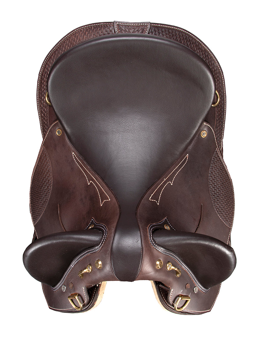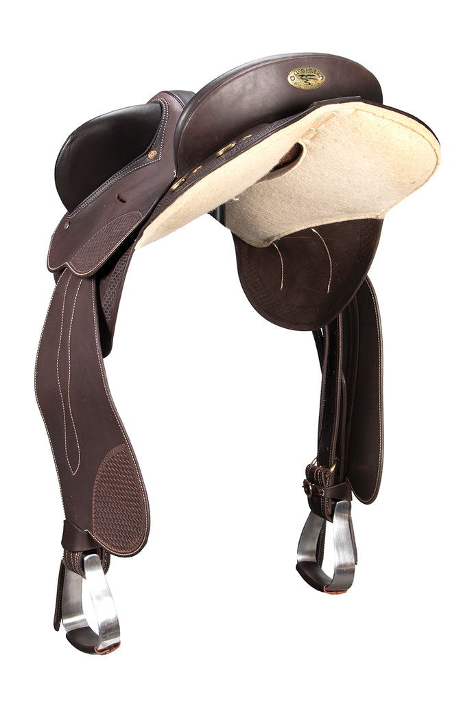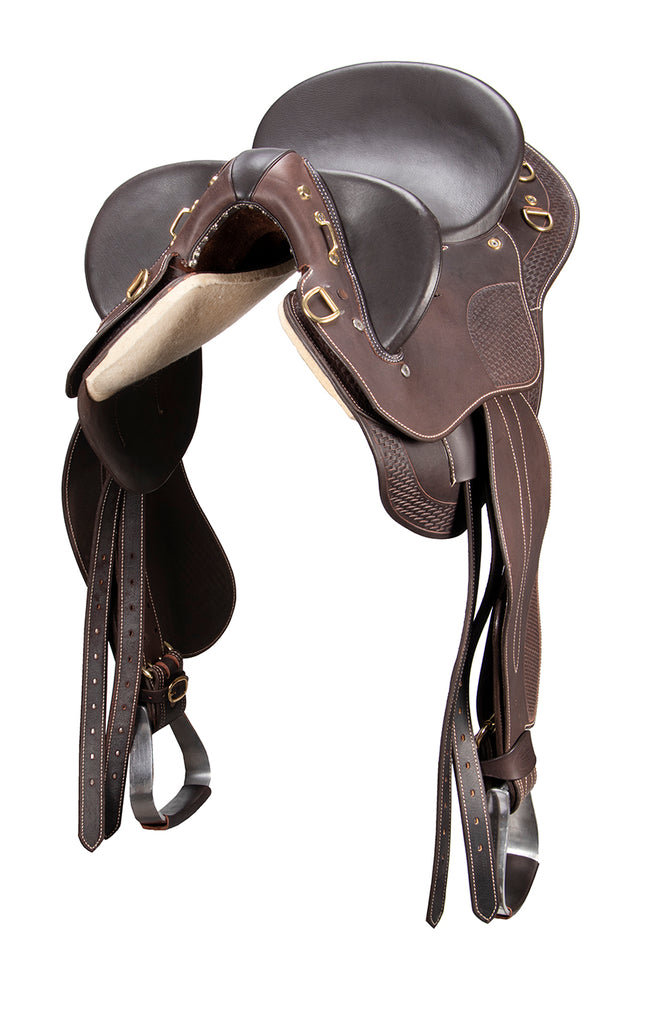 The Ord River Campdraft Saddle with Adjustable Gullet is a high-quality saddle designed for both comfort and security. It is carefully crafted from high-grade cowhide leather combined with felt padding to provide a secure and comfortable riding experience. The saddle features a beautiful basketweave leather embossed design, accentuated with contrast stitching and solid brass hardware for a classic, stylish look.