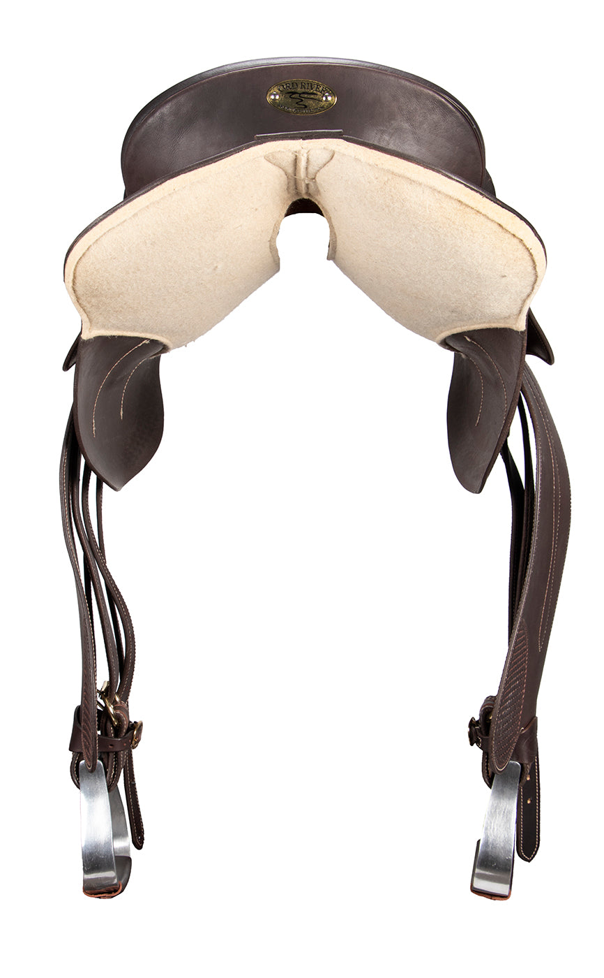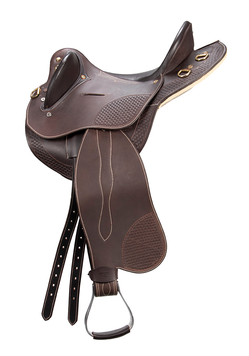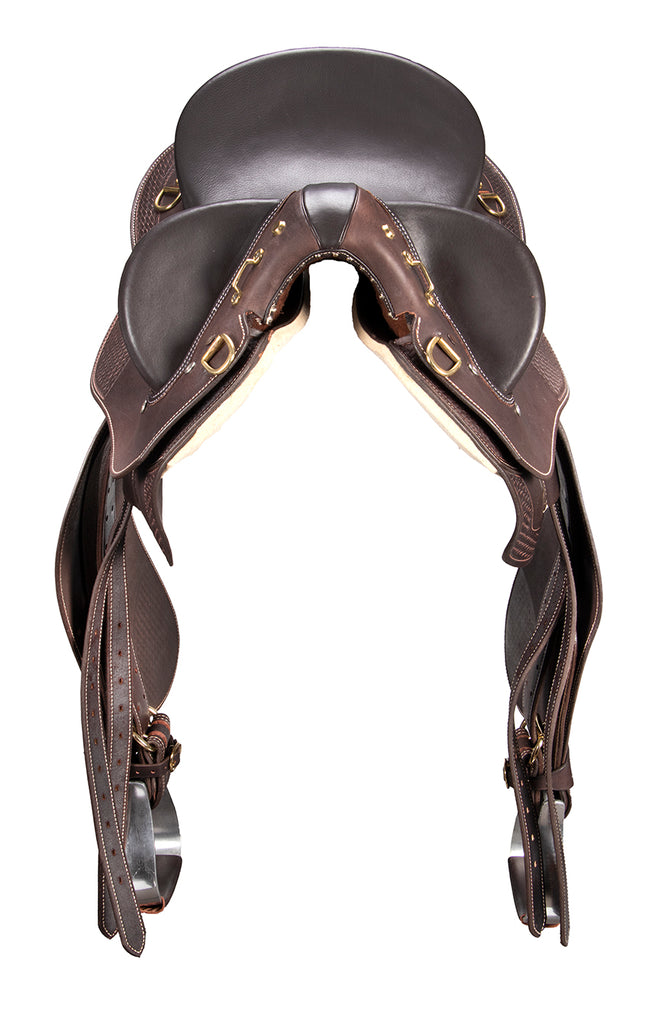 A key feature of this saddle is its interchangeable gullet system, which allows riders to tailor the saddle’s fit to suit different horses. Additional gullet plates are available to customize the fit further. The saddle also includes solid alloy stirrups, double tongue buckles for adjusting the fenders, and comes with a girth top strap with points on each end.