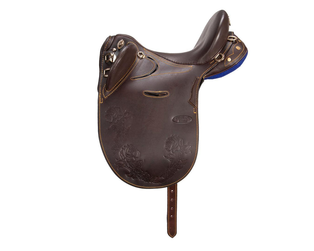 The Ord River Junior Cox Poley Saddle is designed specifically for youths and small adults seeking a secure and comfortable ride. Featuring a deep broken neck and a deeply contoured seat, it offers excellent stability and security, ideal for stock work and everyday riding. Available in 13" and 14" seat sizes, the saddle ensures a proper fit for young riders, allowing for better control and confidence. Crafted from premium leather with classic tooled botanical patterns, this saddle combines durability with timeless country style. The 6" gullet provides a balanced fit for the horse, making it a reliable choice for junior riders.