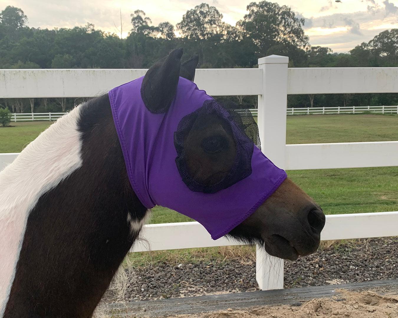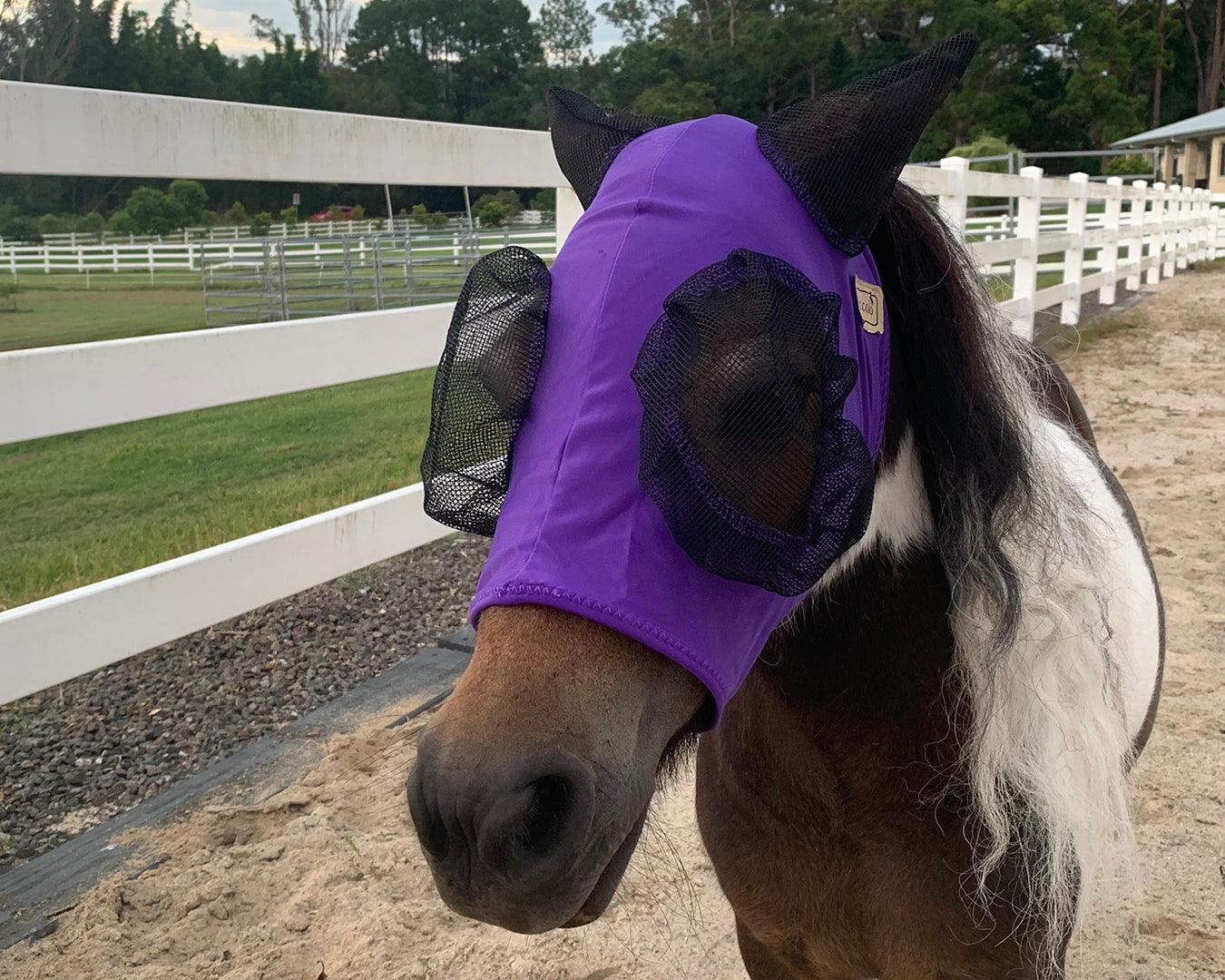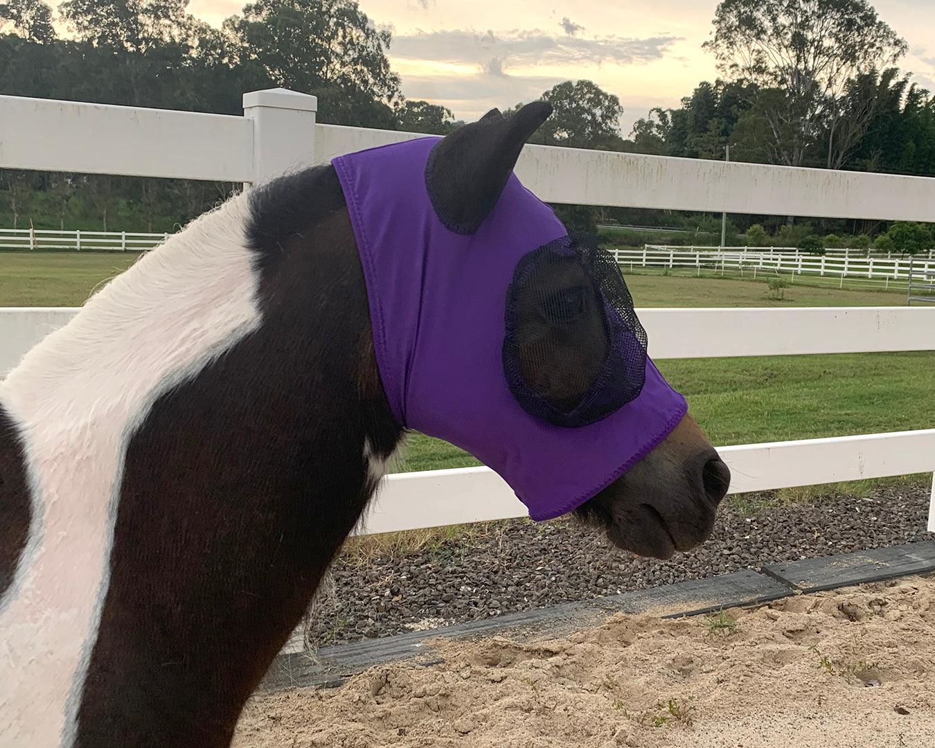 Ensure your miniature horse stays comfortable and free from pesky insects with the Piccolo Lycra Pull-On Fly Mask, available at Greg Grant Saddlery.