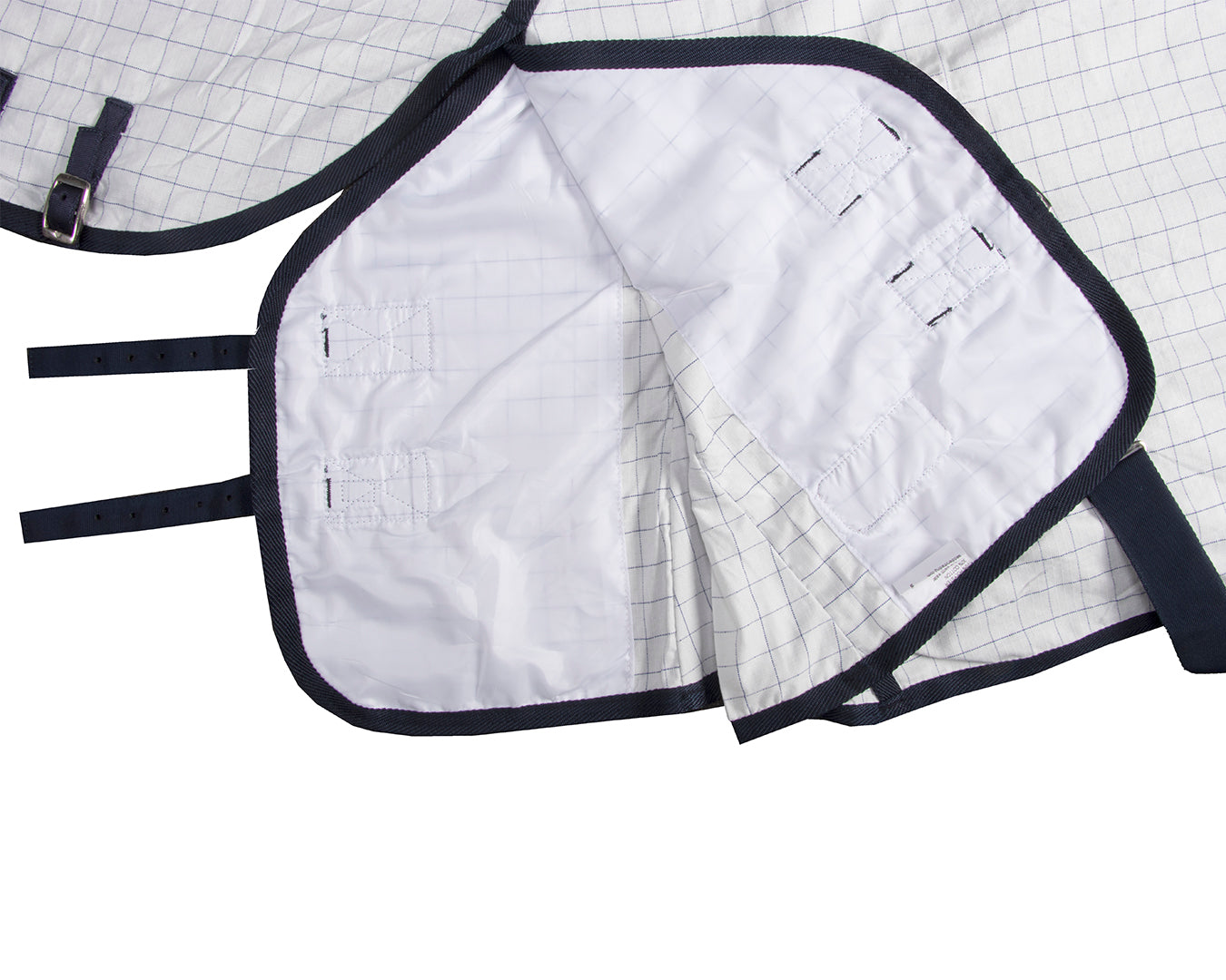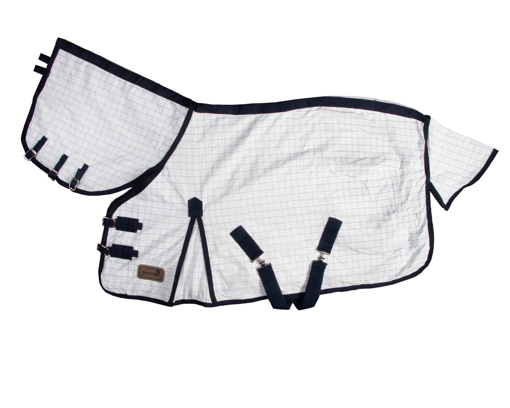 The perfect protection for the summer months. Keep your pony cool, dry and shielded from sunlight with this white polycotton rug combo with a bold blue trim. Designed with little horses in mind, this petite rug is crafted with lightweight 18oz polycotton fabric with twin buckles at the chest and removable leg straps.
