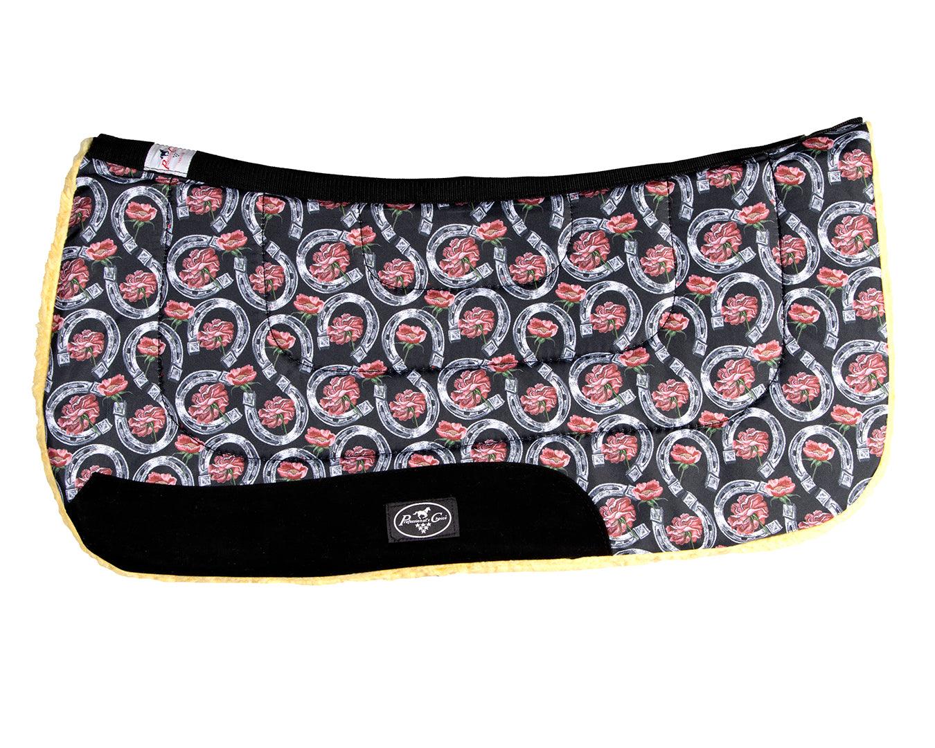 Elevate your riding experience with the Professional's Choice Contoured Work Saddle Pad in Horseshoe design. This 31" x 32" pad combines superior comfort, protection, and durability for both horse and rider. Featuring a contoured design for a snug fit, synthetic fleece underside for cushioning, and durable 600 denier fabric with smooth-wear leathers, it's built to withstand daily use. The elegant Horseshoe pattern adds style to functionality, making it perfect for professional and recreational riders alike. Experience unparalleled comfort and stability during any riding activity. Upgrade your equestrian gear today!