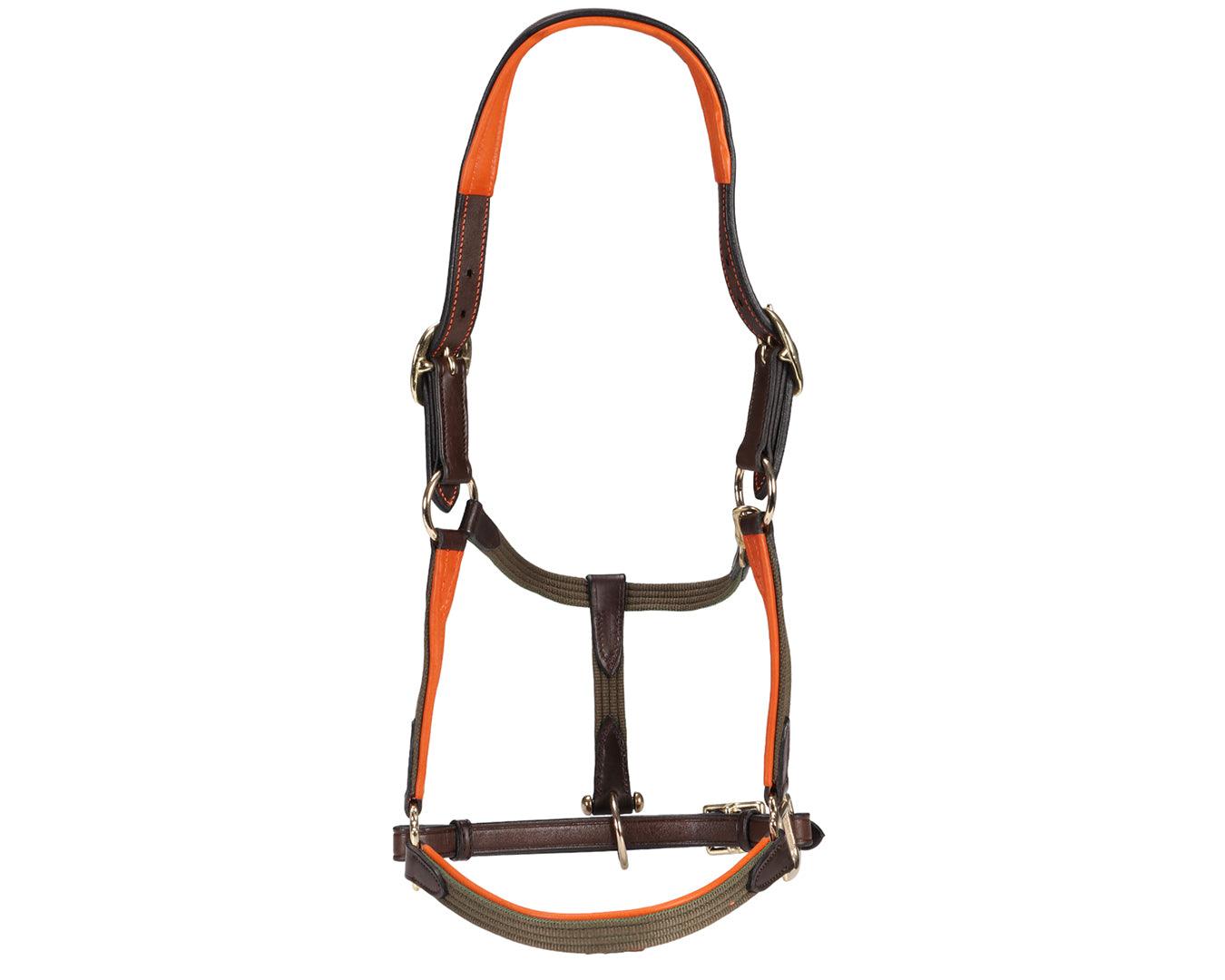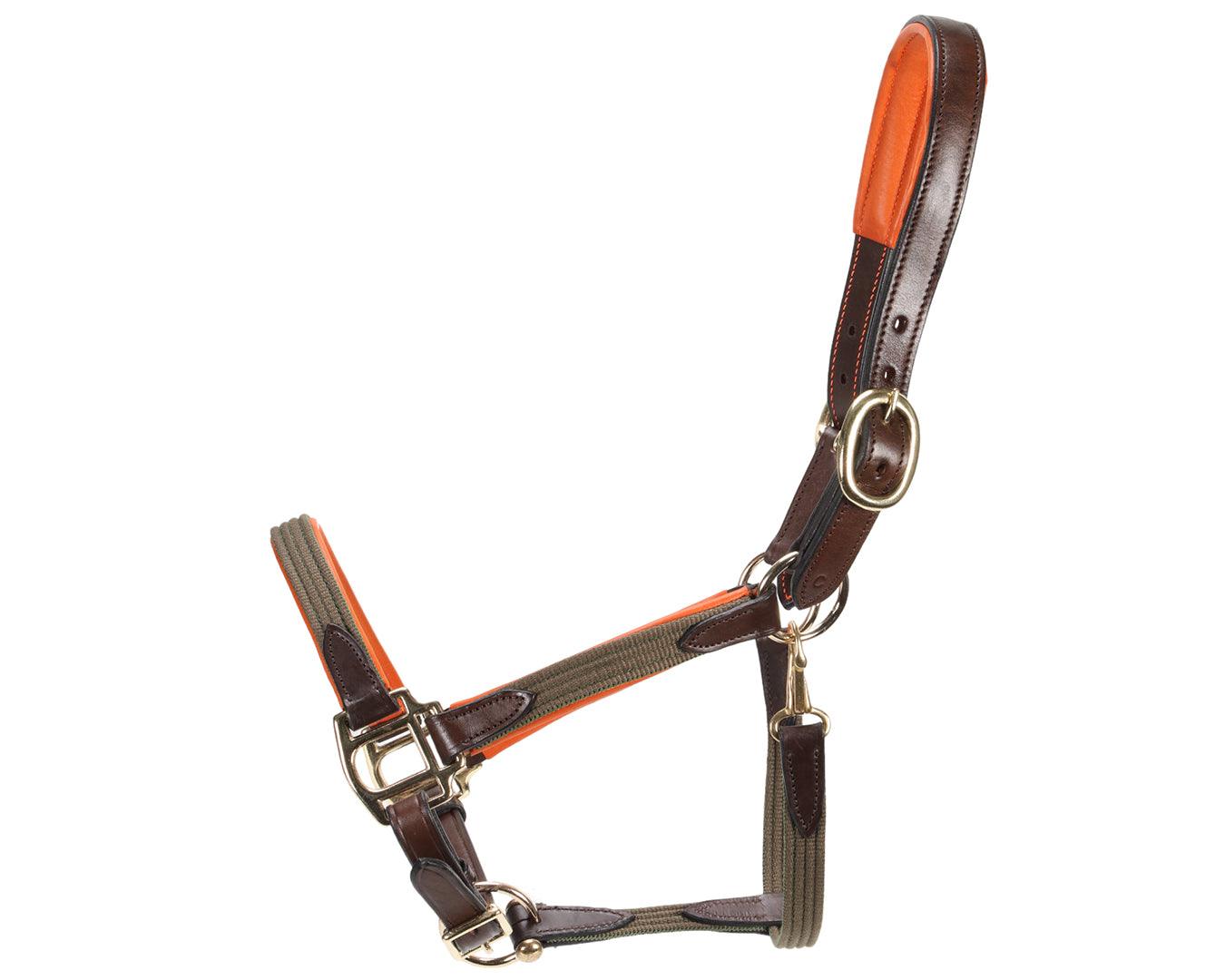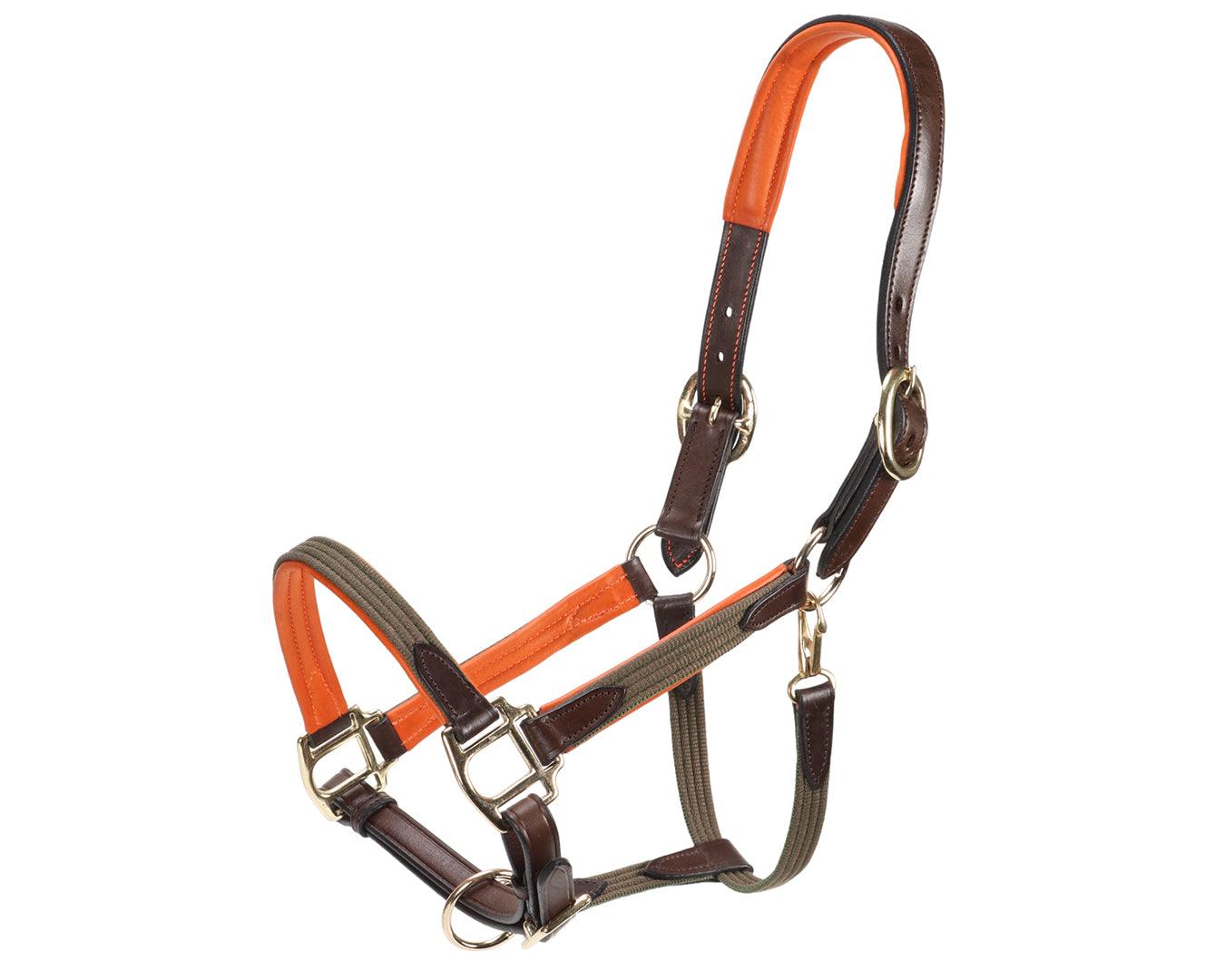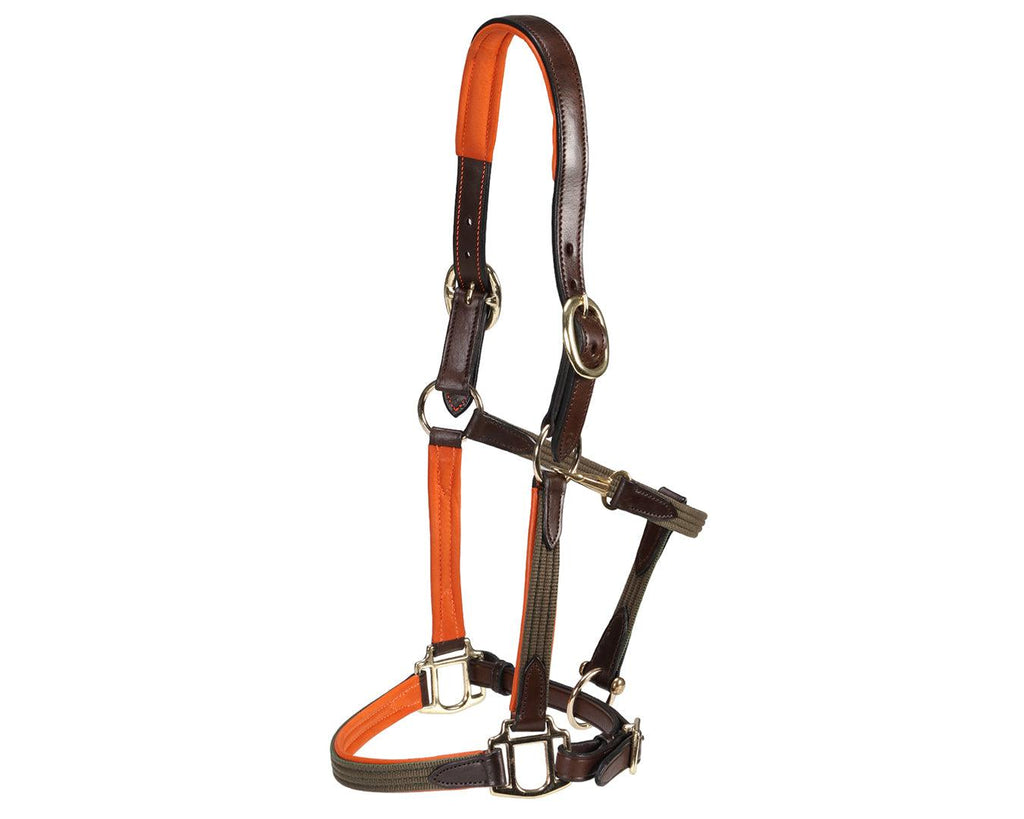 The Sterling Heritage Leather Halter is an attractive and durable stable halter designed for comfort and functionality. Crafted from a combination of leather and cotton web, this halter features decorative webbing that provides added reinforcement. It includes a beautiful contrast padded leather crown, cheeks and nose. Double crown buckles, and solid brass hardware, ensuring a secure fit and lasting quality.