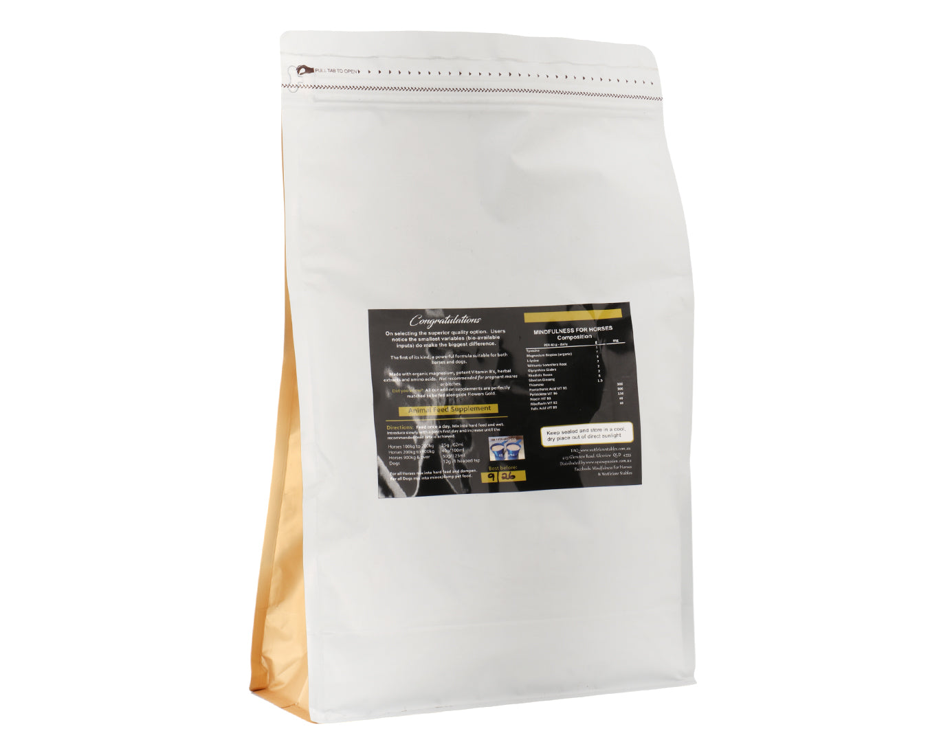 Wattlelane Mindfulness for Horses Supplement is a specialized calming feed supplement designed to support neurological function, reduce stress, and enhance mood in horses. It features a carefully balanced blend of Magnesium (organic Bioplex form), Amino Acids (including Tyrosine and L-lysine), Vitamin B complex (B1, B2, B3, B5, B6, B9), and potent plant extracts such as Ashwagandha, Rhodiola Rosea, Glycyrrhiza Glabra (licorice), and Siberian Ginseng. These ingredients are known to help settle nerves during stressful situations, improve focus and trainability, support memory, and reduce anxiety.